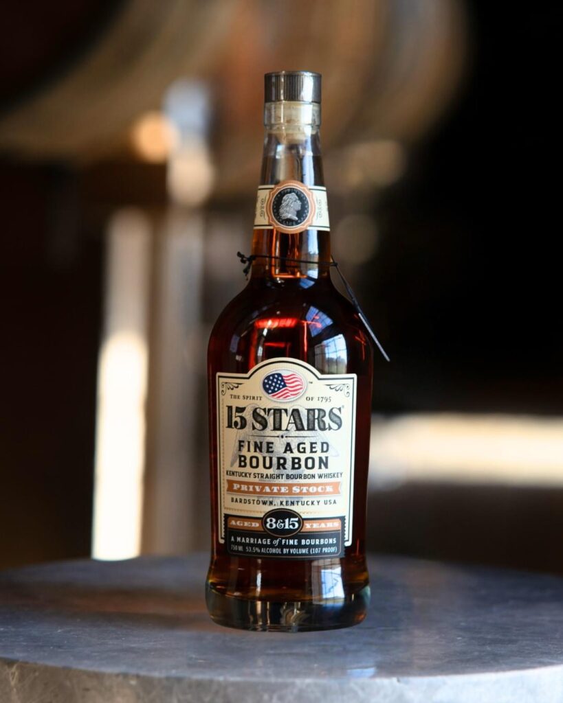 15 STARS 8 & 15 YO Private Stock Fine Aged Bourbon, bottled at 107 proof (53.5% ABV), is a blend of Kentucky straight bourbons aged 8 and 15 years, a familiar expression to fans of the previously released 7 & 15 Private Stock. With an extra year of aging, the new release has a nose reminiscent of a gourmet candy shop with confectionery notes of toffee, fudge, fruit cake, and honeycomb. This expression is rich on the palate from opulent flavors of black cherry, bananas foster, and caramelized sugar followed by charred oak and cigar box—which exhibit the extended aging of the blend. The black cherry flavor remains on the palate and carries to the end of an ever-enduring finish, completed by the appearance of roasted nuts, coffee, and chamomile tea.
