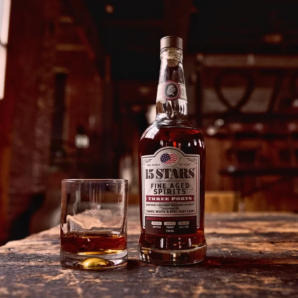 According to the brand, 15 STARS Three Ports Fine-Aged Bourbon features a rich nose with aromas of concord grape, plum, blueberry, honeysuckle, vanilla extract, and dried fruit, including apple, banana, pear, and peach. The bouquet is balanced with hints of baking spice and seasoned oak. On the palate, the bourbon reveals flavors of blackberry, dates, pineapple juice, golden raisin, and meringue, evolving into cinnamon, fresh wood, and light ground pepper. The finish offers lingering notes of mixed berries, fruit cake, grape, plum, and aged oak.
