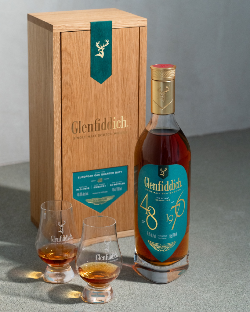To commemorate the partnership, Glenfiddich is releasing a rare 1976 Single Malt Scotch Whisky, aged for 48 years and finished in a specially coopered European oak sherry cask hand-selected by Malt Master Brian Kinsman. The whisky represents a transformative era for both brands—the 1970s—when Glenfiddich introduced the stag’s head emblem and expanded its distillery, while Aston Martin advanced its design and performance innovations.