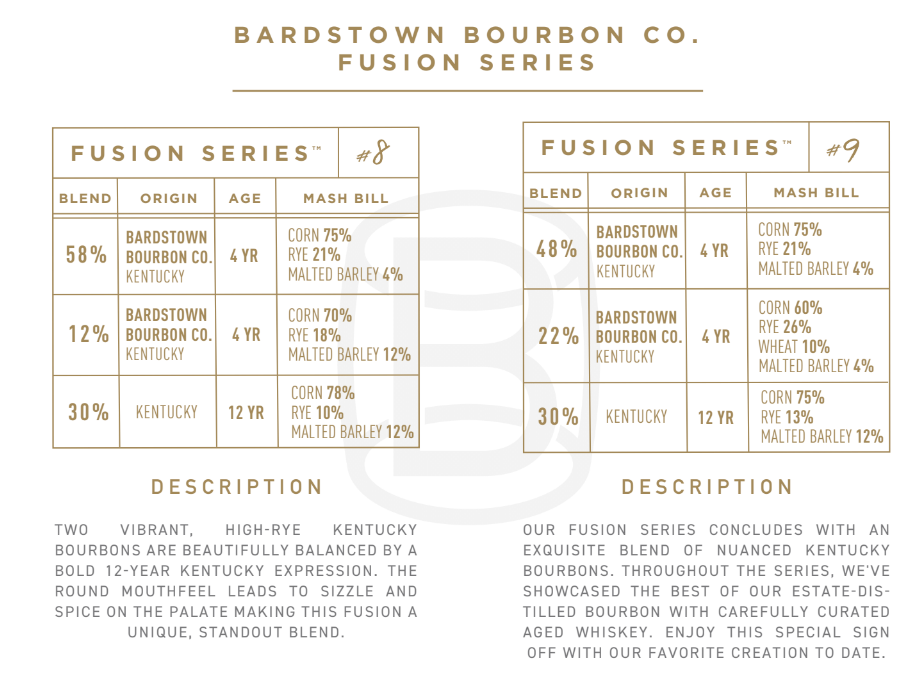 Fusion series releases combine older sourced whiskey and younger bourbon which has been distilled and aged by Bardstown Bourbon Co. and shows a range of mashbills across the blends including corn, rye, wheat and malted barley. The journey of the unique series has been to see the changing flavor profiles as the Bardstown Bourbon Co. bourbon ages, becoming more prominent in the blends over time as the distillery has established itself as a major player in the industry. Both Fusion 8 and Fusion 9 feature 4-year-old bourbon from Bardstown Bourbon Co., the oldest bourbon yet released by the brand.
