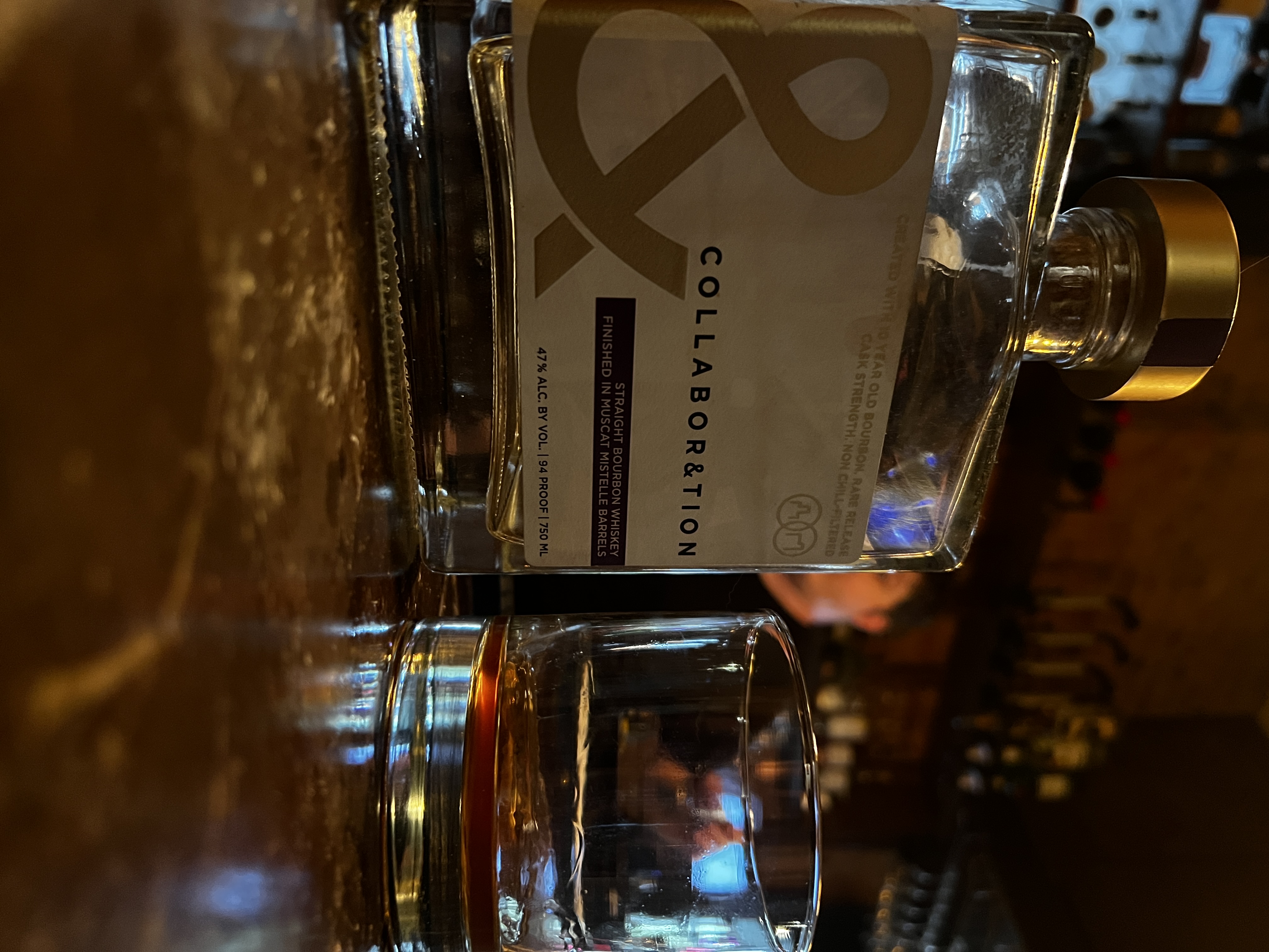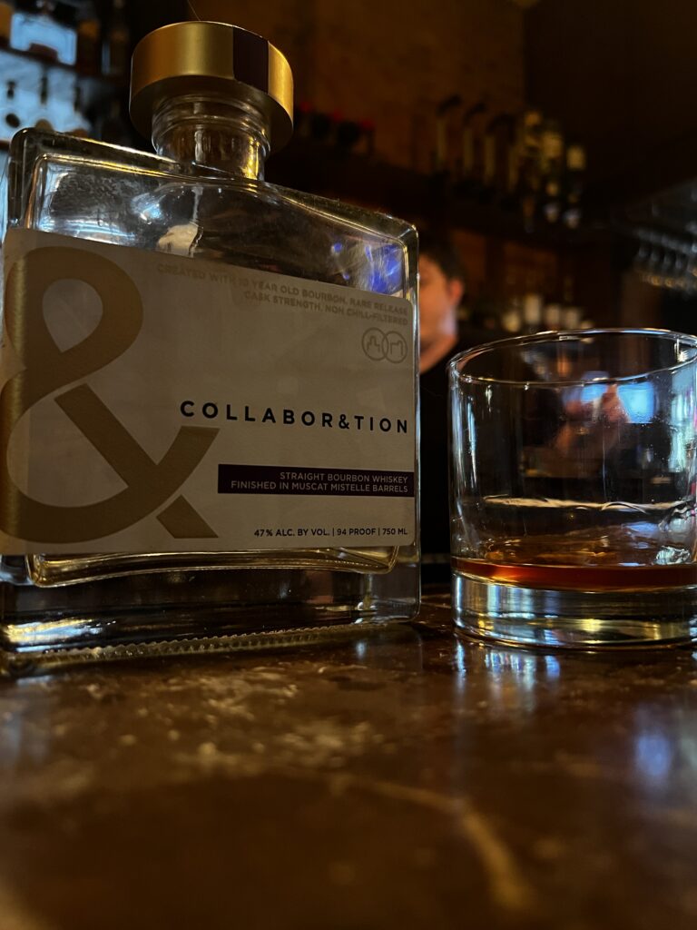 Headed south to Bowling Green for my buddy Brad’s wedding. After a brief rehearsal we headed to dinner at “The Bistro”. While the first round of drinks were a part of dinner thanks to Brad’s parents, I had to go over to check out the bar. At first glance I didn’t notice much until; my eyes caught one of the best pours I have had in recent memory sits on the shelf begging for a bottle kill in Bardstown Bourbon Company Muscat Mistelle collaboration.