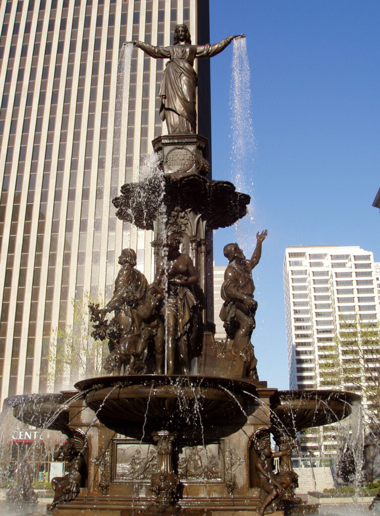 What many people in Cincinnati don’t know is that the four figures around the outside of the fountain were actually meant for drinking water and were a very important request by the fountain’s donor, Henry Probasco, during the design of the fountain. When the city accepted the gift of the fountain in 1871 it came with the following conditions that “the city will maintain said fountain in complete order, and forever supply the drinking conduits thereof with pure drinking water for the free use of all who may resort thither at any hour of the day or night.”
