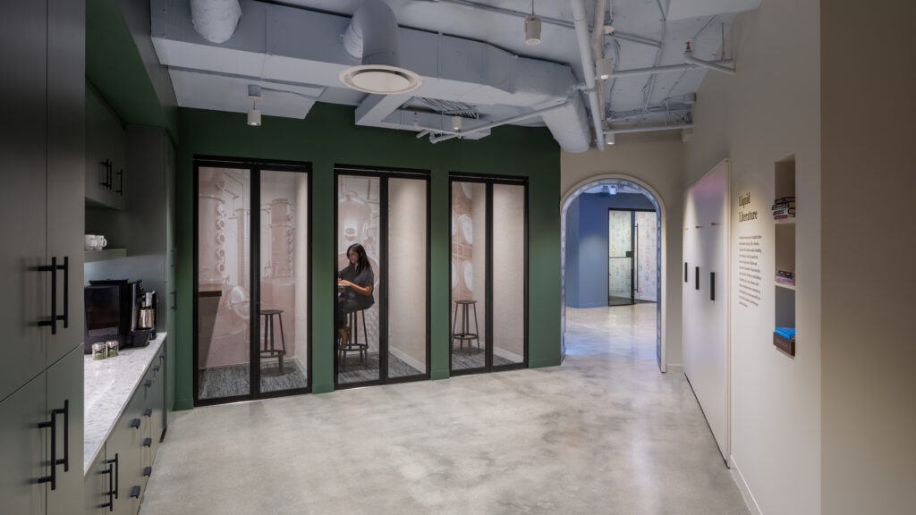 Special spirits-related themes are featured throughout the office. Illustrations of agriculture, stills, barrels and aging warehouses depict the distillation process from field to glass, and a wall showcasing a wide-range of jobs from farmers to distillers to bartenders underscores the spirits industry’s significant economic contributions.