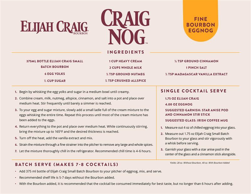 Available for nationwide shipping, the Craig Nog cocktail kit allows you to craft the perfect holiday drink at home. Each kit includes a 375ml bottle of Elijah Craig Small Batch Bourbon, premeasured Craig Nog ingredients, and a limited-edition etched pitcher—ideal for enjoying Craig Nog for many holidays to come.