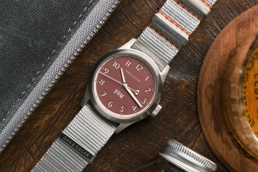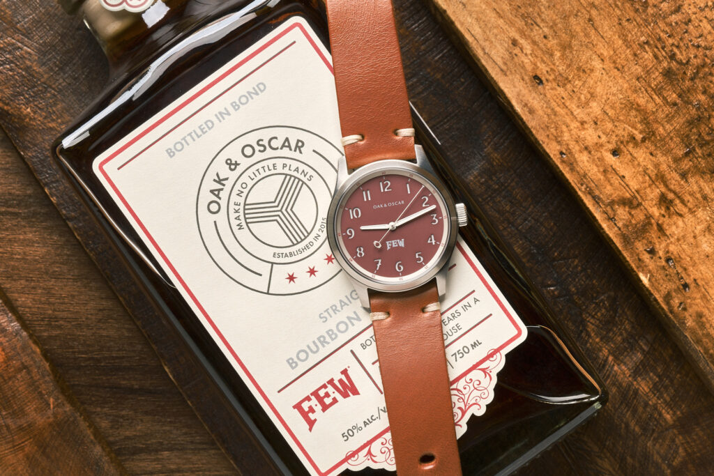 Chicago-based watchmaker Oak & Oscar just announced a limited edition collaboration with their friends, FEW Spirits. The Olmsted FEW limited edition features the same field watch capability you know and love but with a few extras that make this whiskey-watch collaboration special. Regular readers of Bourbon Lens may have noticed a trend in the Whiskey and Watches Worlds as these brand collaborations are on the uptick. And, we’re big fans! Additionally, this collaboration promises to deliver on the whiskey side of the house with an equally limited edition FEW bourbon to enjoy while you’re admiring your wrist.