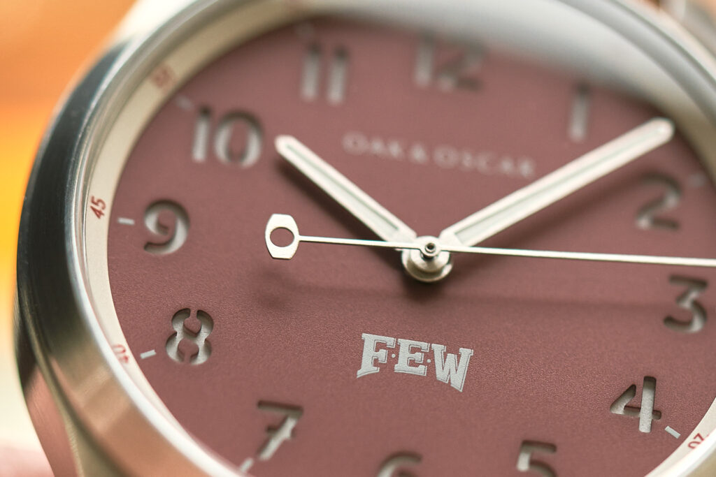 This limited edition timepiece features brushed hands that contrast nicely with the dial. The FEW logo is proudly displayed just above the 6 o’clock position while the Oak & Oscar mark is printed just below 12 o’clock.