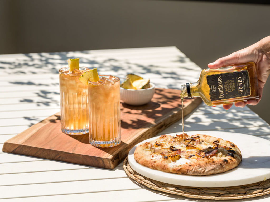 I like offering different ways to enjoy bourbon, outside of its traditional expectation. Four Roses is such an iconic brand, so it was fun to incorporate a fresh twist by infusing Small Batch’s delightful fruit and spice notes into a new product. Using the honey in these new cocktail recipes, and collaborating with Ooni’s team to develop flavor pairings, we crafted cocktails with refreshing, sessionable, and complementary flavor profiles, unique to their pizza recipes.