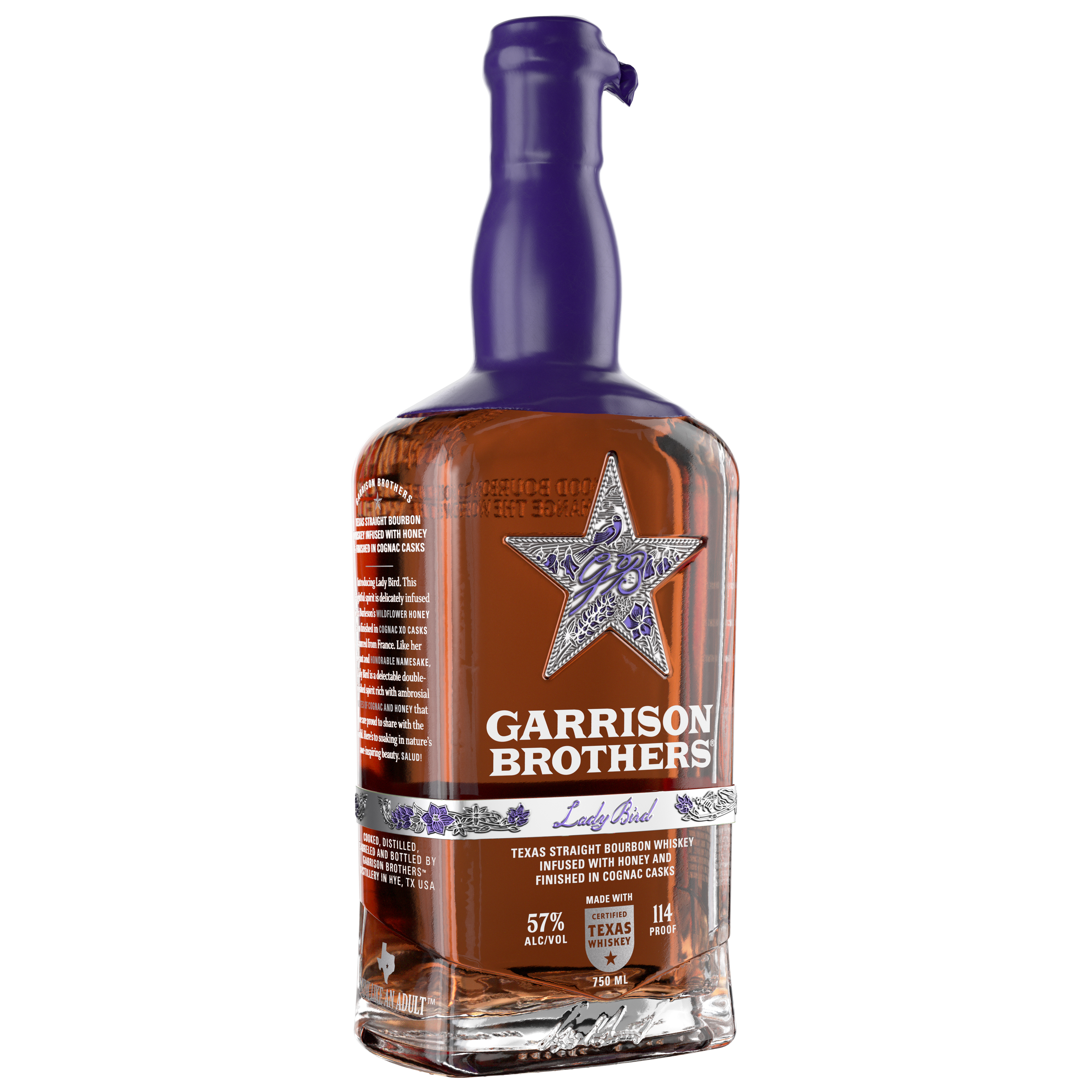 Lady Bird, Texas honey-infused cognac-finished bourbon, starts its life as Small Batch that is aged for 4 years in new white American oak barrels before being infused with Burleson’s Texas Wildflower Honey for an additional 8-9 months, creating the exquisite cask strength HoneyDew. The bourbon is then transferred into French Cognac XO casks to mature for an additional 3 years. It is bottled at 114 proof, and each bottle is hand-sealed with a delightful Prairie Purple wax.