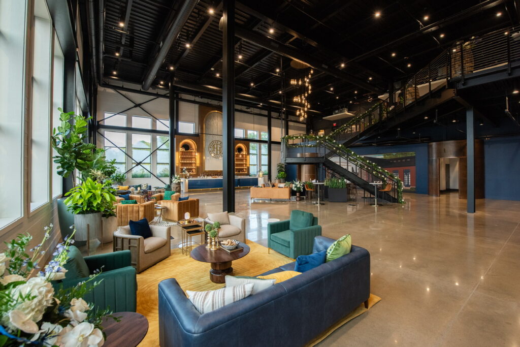 The facility’s architecture, led by Joseph & Joseph and Buzick Construction, incorporates historic and natural details, including reclaimed bricks and wood from the Thomas Speed House, a two-story bar, custom copper tanks, and handcrafted brass accents. Benches made from salvaged Speed House wood pay tribute to Parker Beam and the original Old Heaven Hill Springs Distillery.