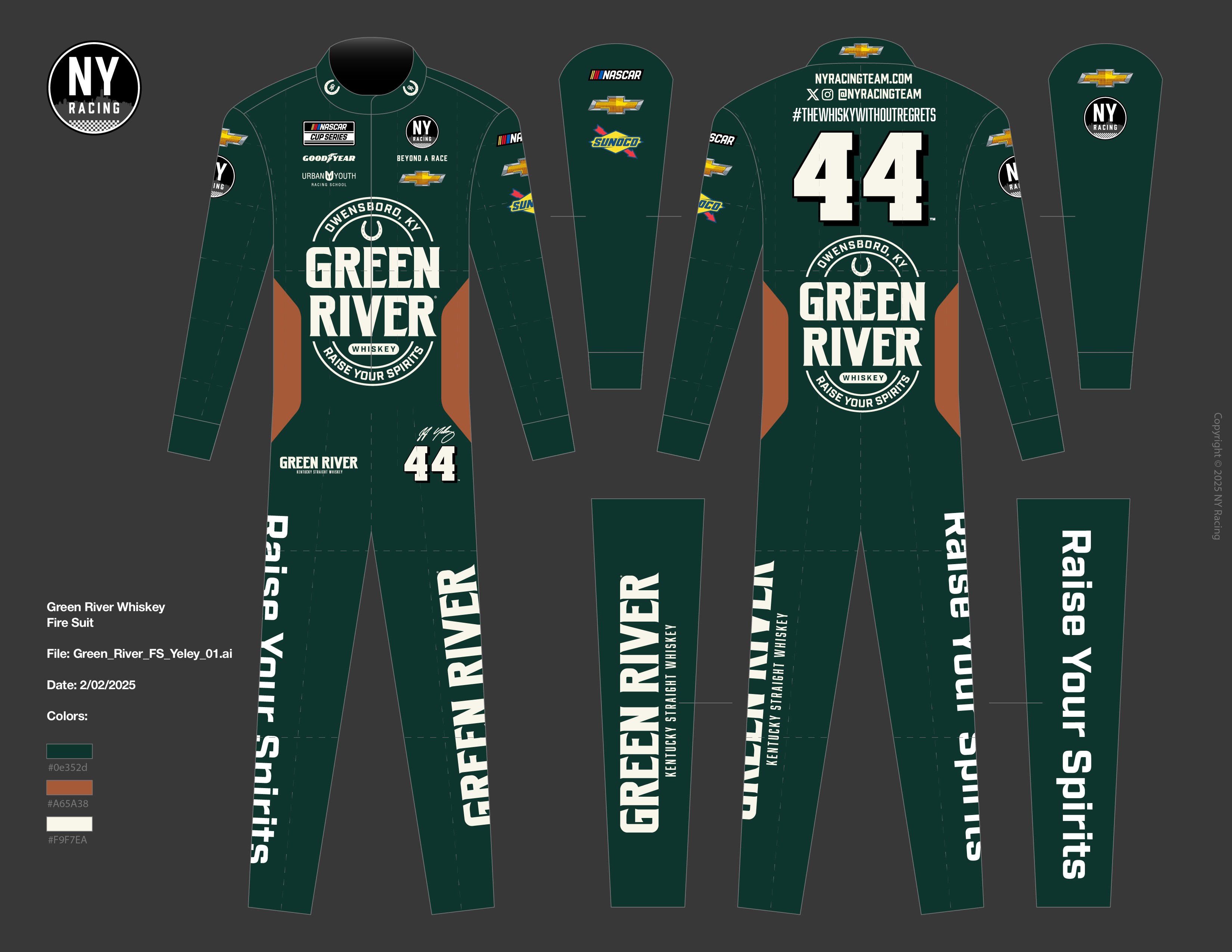 Green River Whiskey is the primary sponsor of the No. 44 Green River Whiskey Chevrolet with NY Racing Team and NASCAR driver J.J. Yeley as they race to qualify for the 2025 Daytona 500.