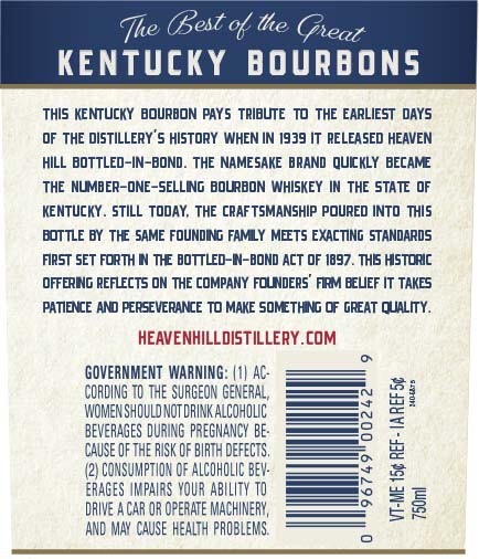 The front label prominently features “Bottled-in-Bond” across the top, an embossed “Heaven Hill” in the middle along with an illustration of Old Heaven Hill Springs distillery, the distillery first used in 1935, and the phrase “This Bourbon is 7 Years Old” adorns the bottom calling out the age statement. A gold foil, embossed Heaven Hill Distillery medallion is featured on the bottom label, the same emblem that marked the Heaven Hill 27-Year-Old Bottled-in-Bond packaging. To complete the packaging, the back label includes the historic tagline “The Best of the Great Kentucky Bourbons,” along with the history of the namesake brand.