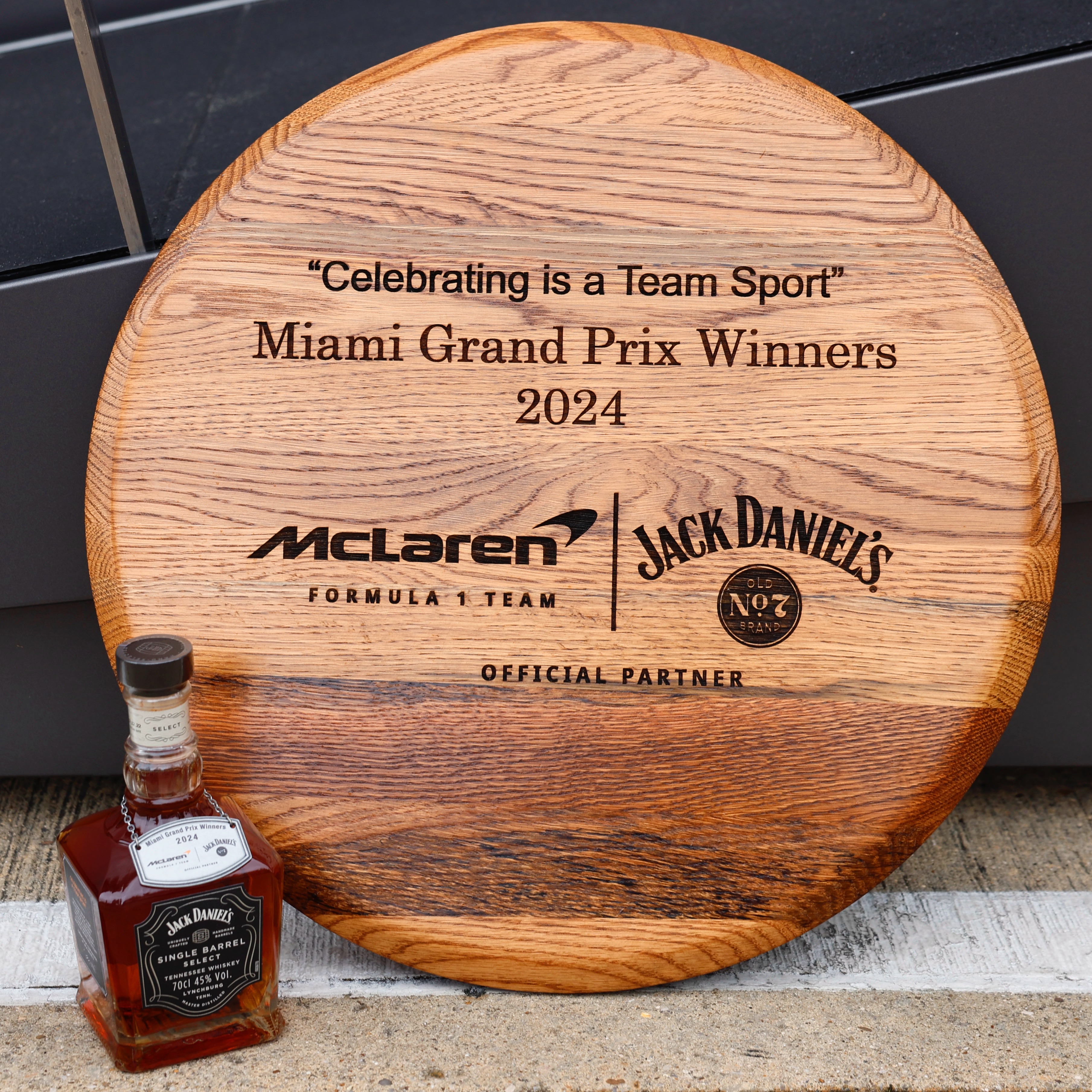 - Jack Daniel’s presented McLaren Racing CEO Zak Brown with a personalized barrel head and a specially selected barrel of Single Barrel Select Tennessee Whiskey to celebrate Lando Norris and McLaren Racing’s win at the 2024 Miami Grand Prix.