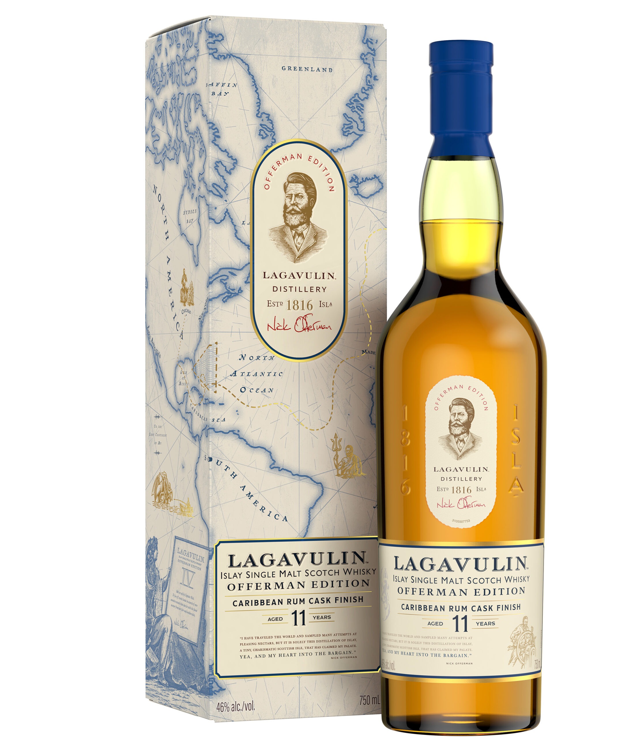 Offerman’s collection of limited-edition whiskies with Lagavulin reflect his passions, favorite flavor profiles and places he loves to venture. With the fourth release, Nick sought to immortalize his expeditions through a bottle label that intricately depicts a journey through Caribbean sunshine, rough and stormy seas, and leagues in between to craft a dram that fuses the citrusy, maritime flavor influence of rum, anchored by Lagavulin’s home on Islay, the capital of peated, smoky whiskies.