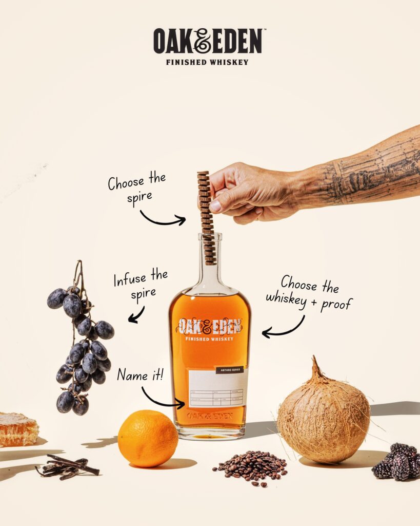 Builders can also select their spire to be infused with Coffee, Vanilla, Grapefruit Liqueur, Orange Liqueur, Pineapple Liqueur, Blackberry Liqueur, Cabernet, Port Wine, Rum, Honey, or Maple Syrup which is then inserted into the bottle. Oak & Eden plans to add to its infusion options, introducing seasonal and limited l-batch options quarterly, making the possibilities with Whiskey Customizer truly limitless.