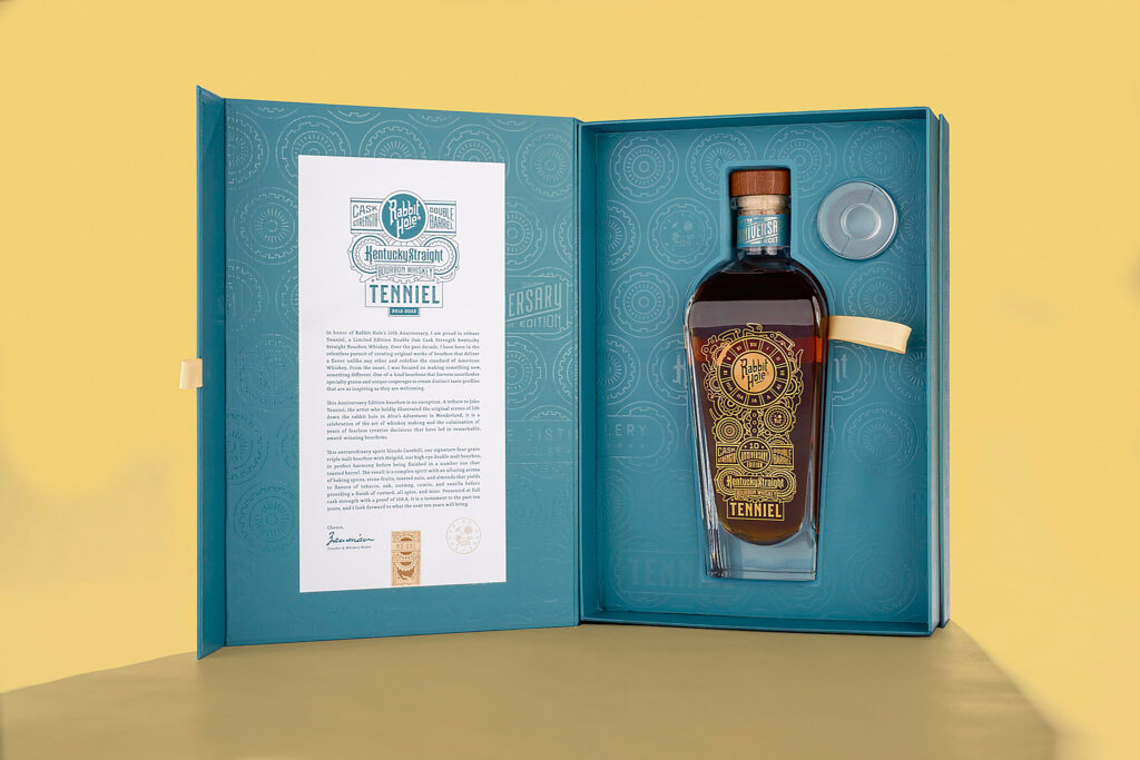 Rabbit Hole Tenniel is now available. A total of 939 sequentially-numbered crystal decanters and premium gift boxes are being released for sale at Rabbit Hole Distillery and for purchase online in limited markets for a suggested retail price of $650.