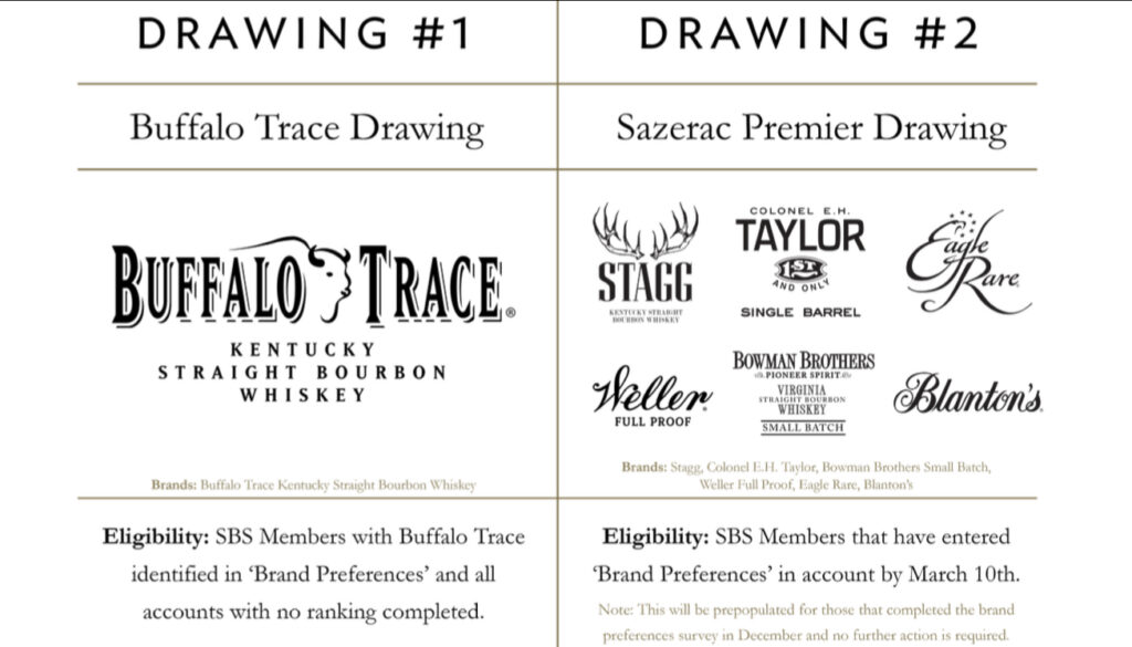 Access your SBS Account and complete your brand ranking in the ‘Brand Preferences’ section by March 10 to be eligible for the Sazerac Premier Drawing.